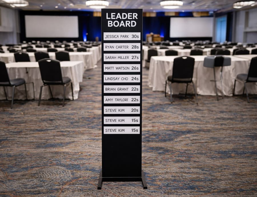 Track top performers instantly with our Leaderboard Hire, a magnetic scoreboard designed to turn any activity into a visible and motivating competition. Clear, structured and easy to read, it creates that “Top Gear lap time board” effect — simple, bold and instantly engaging for both participants and spectators.