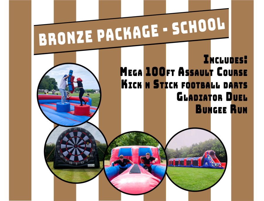 Our School Bronze Package is a high-energy inflatable package designed specifically for school events. It includes a Mega 100ft Assault Course, Bungee Run, Football Darts / Kick & Stick, Gladiator Duel, plus 3 professional event staff to ensure safe operation and smooth event flow throughout the day.
