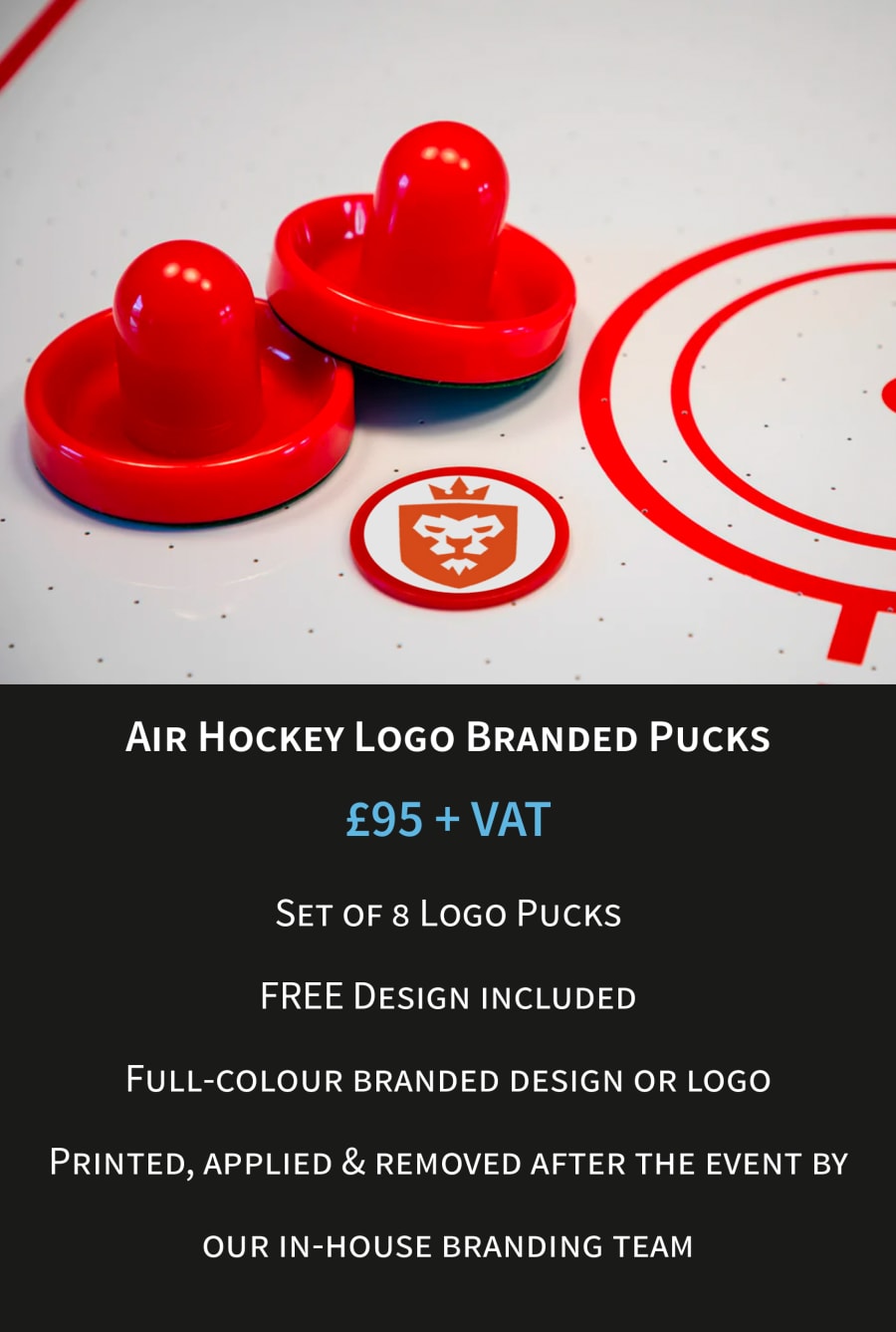 We offer branded pucks with our air hockey table rental, as well as a selection of extra items to enhance your corporate event hire, such as mood lighting to set the tone or a Top Gear-style leaderboard to keep track of the air hockey competition. For a premium interactive experience, our LED Glow Air Hockey Table can be fully customised with your brand colours and logos. Contact our team for more information about branding options.