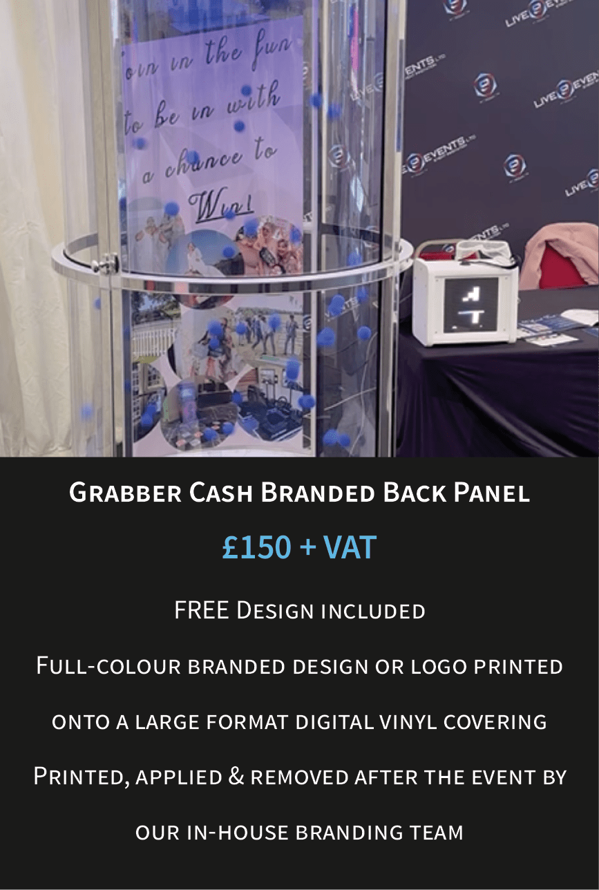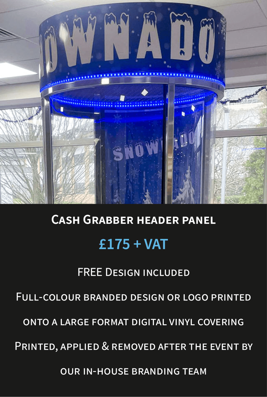 Our cash cube grab a grand hire can be customised with any branding for you such as a branded front panel, entire back panel or complete lower half branding, perfect for product launches. Get in touch with our team and let them know your cash cube concept, we can assist with the designing of the grab a grand machine and also handle the complete machine printed assembly of the custom branded panels.