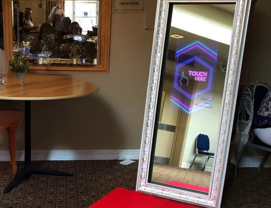 This Magic Mirror Photo booth is a 5ft tall touchscreen magic mirror, allowing guests to see their entire reflection which allows for full length body selfies.
